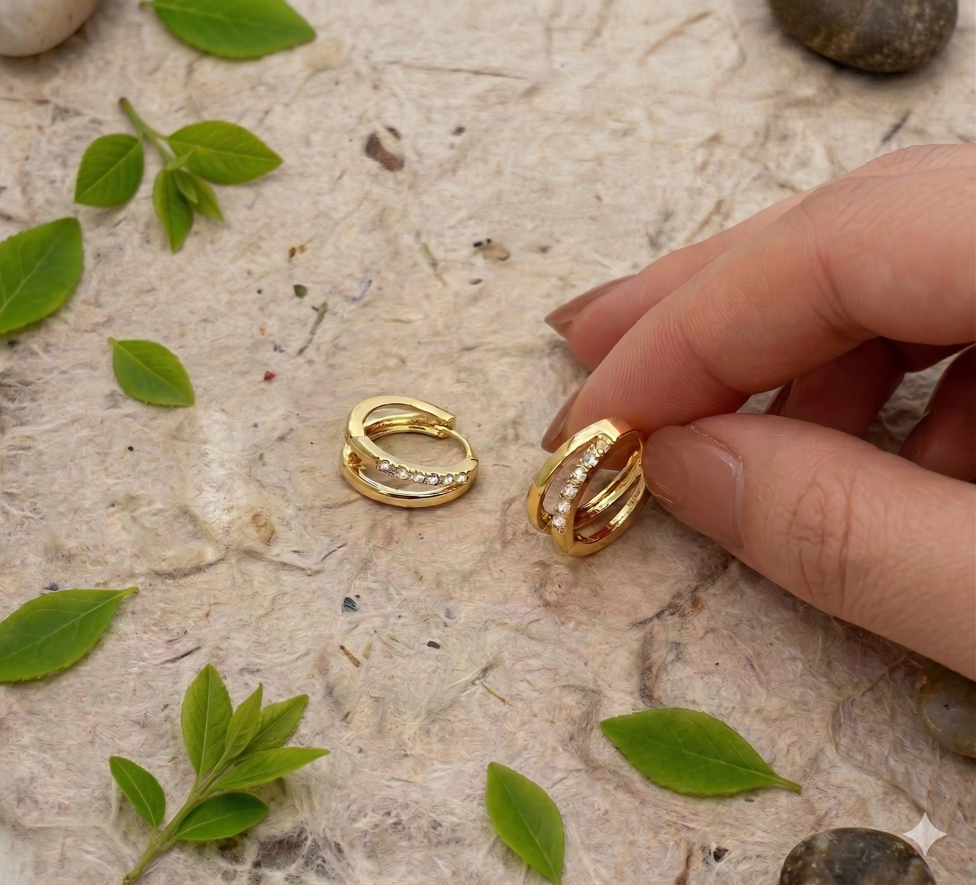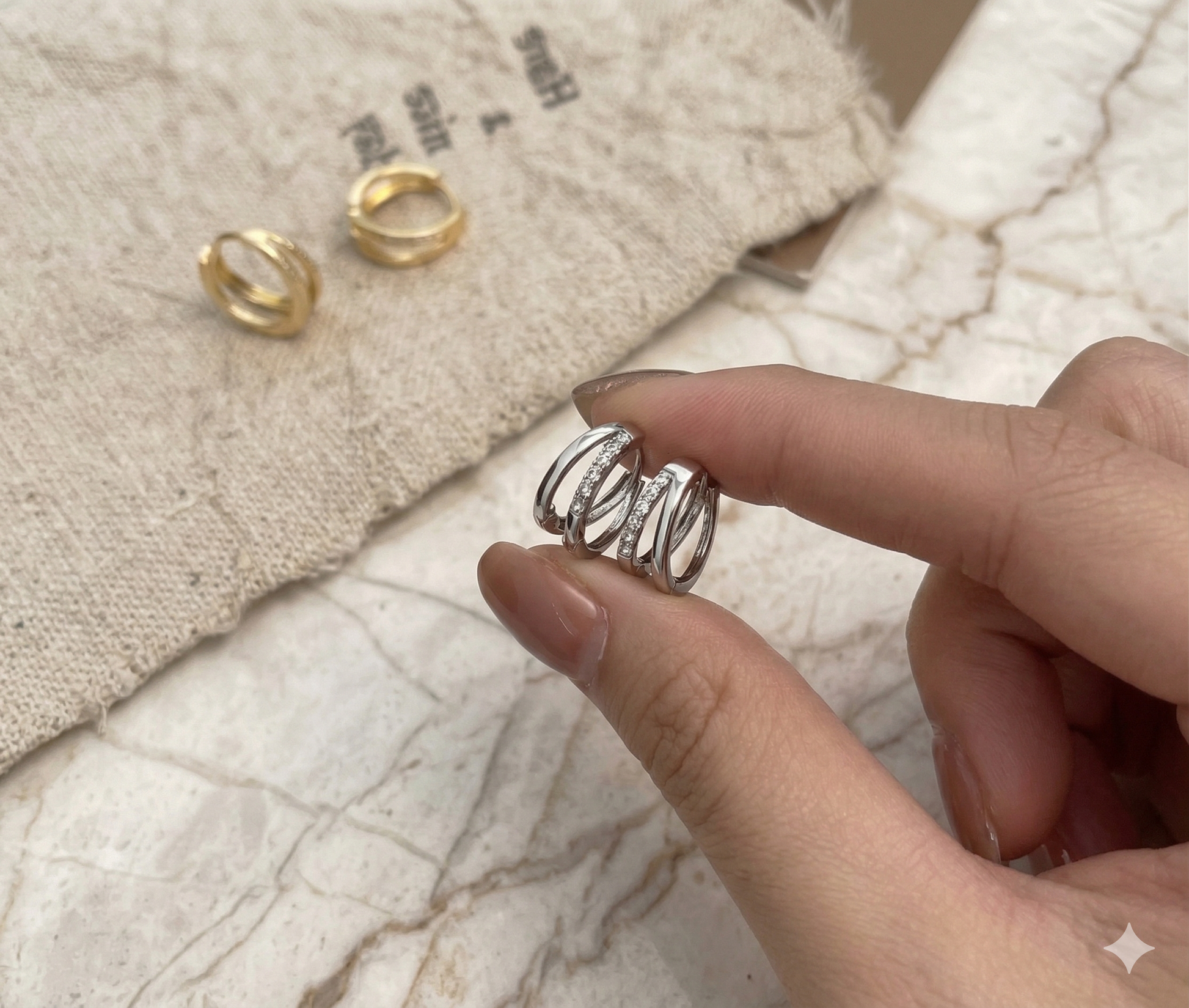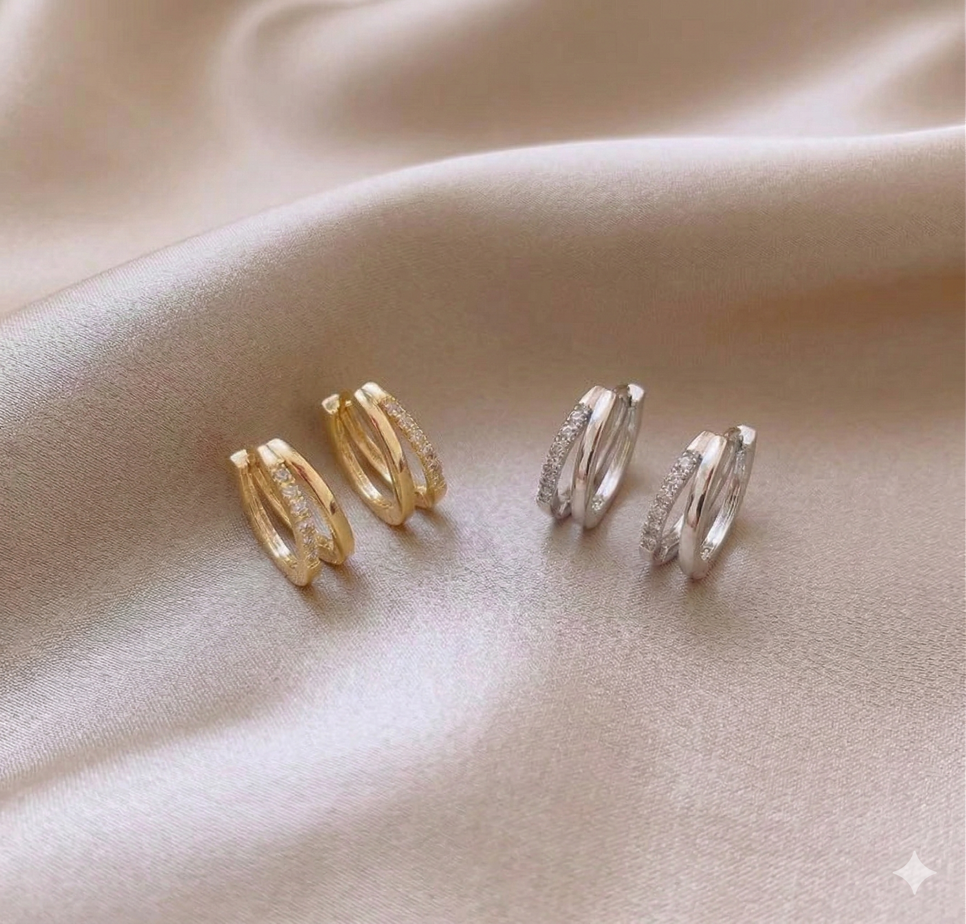 フランス語で「輪」を表す「アノー」練されたダブルフープデザインに、ストーンの光が華やかに煌めきます。耳元に立体感と輝きをもたらし、見る角度によって違った印象を与えてくれます。